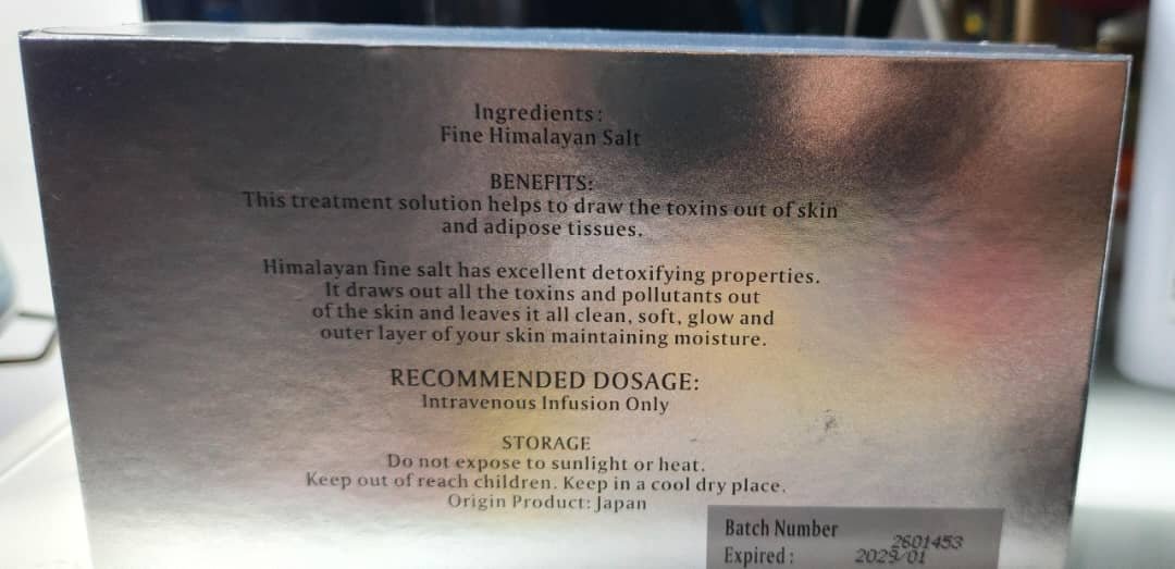 – Administration : Perfusion intraveineuse pour la détoxification (à diluer dans 500 ml de NaCl à 0,09 %). Recommandée avant l’utilisation de tout nouveau produit éclaircissant.